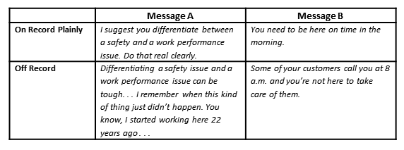 Would the On Record Plainly version of Message A be better than the Off Record version for every management situation? What about for Message B? Hopefully, you can think of some situations in which the less clear (Off Record) version of the message would be the better choice — at least for Message B. (I don’t mean to imply that confronting an employee’s performance problems clearly is never the best course of action, only that most often it’s not in the best interest of the organization to ignore an employee’s feelings or needs. I’ve mentioned the negative consequences of such behavior before.)