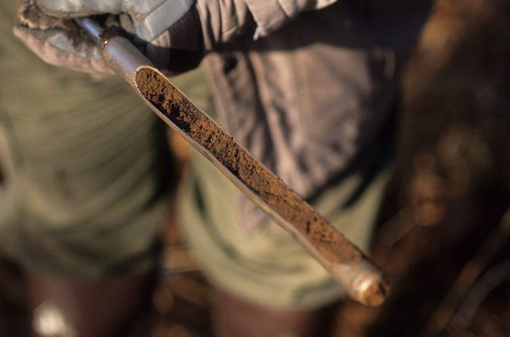 Several weeks later a geologist from the USGS is bending down digging into the soil on some land near Valentine. |